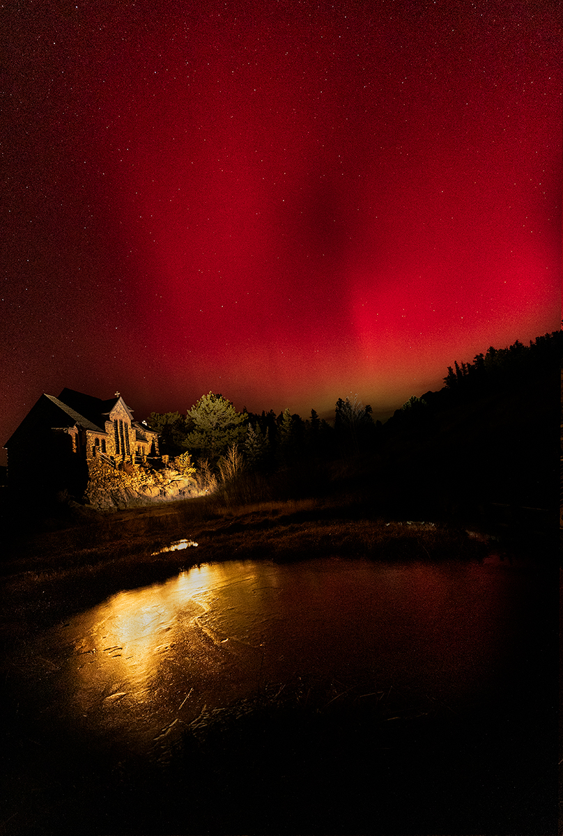 The app said 1% chance of seeing the aurora last night, but a friend forwarded shots from a friend in Denver, then added his own (he's 30-45 minutes south of me & 1000' lower), so I took off for my favorite local aurora destination @ 30 minutes away. At first, the lights were mostly NE, (to the right of the chapel) but after about a half hour, they edged more to the north.