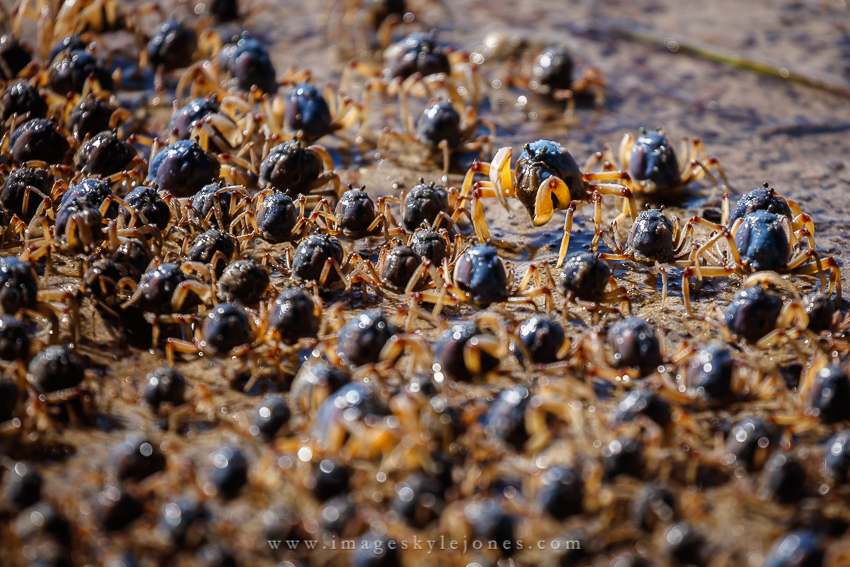 I made my trip to New Zealand and Australia in early March, but I had so many pictures I ran out of steam processing them. I finally got to these shots I took at the Tilligerry Habitat where we were looking for wild Koalas. We didn't find any Koalas, but we did find swarms of these soldier crabs taking advantage of the low tide. I liked both wider views showing the group as well as tighter shots highlighting some individual crabs. For the sake of scale, the largest crabs are probably less than an inch wide.