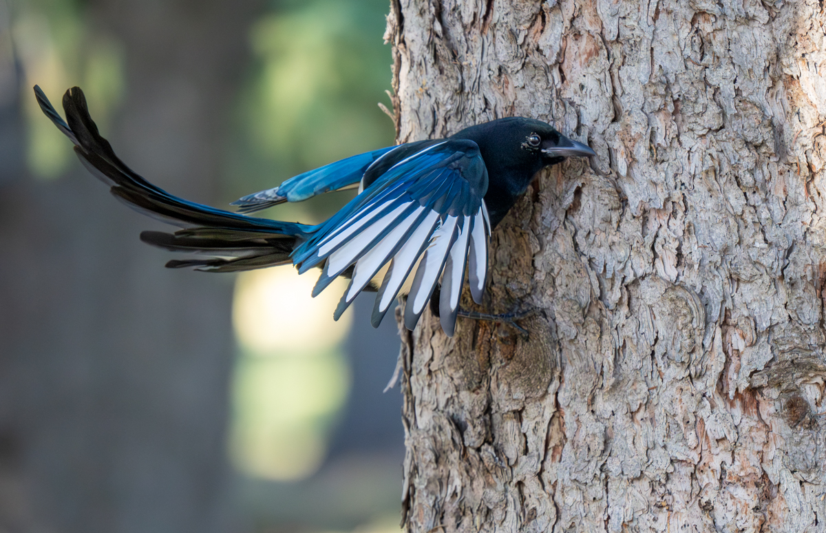 I had never witnessed this behaviour in a Magpie before. It was moving up and down the dying spruce trees in a local park. It would get its beak under some bark and flick it off and search for insects. It looked very much like woodpecker behaviour without the head pounding and a much less efficient use of the tail as body support.