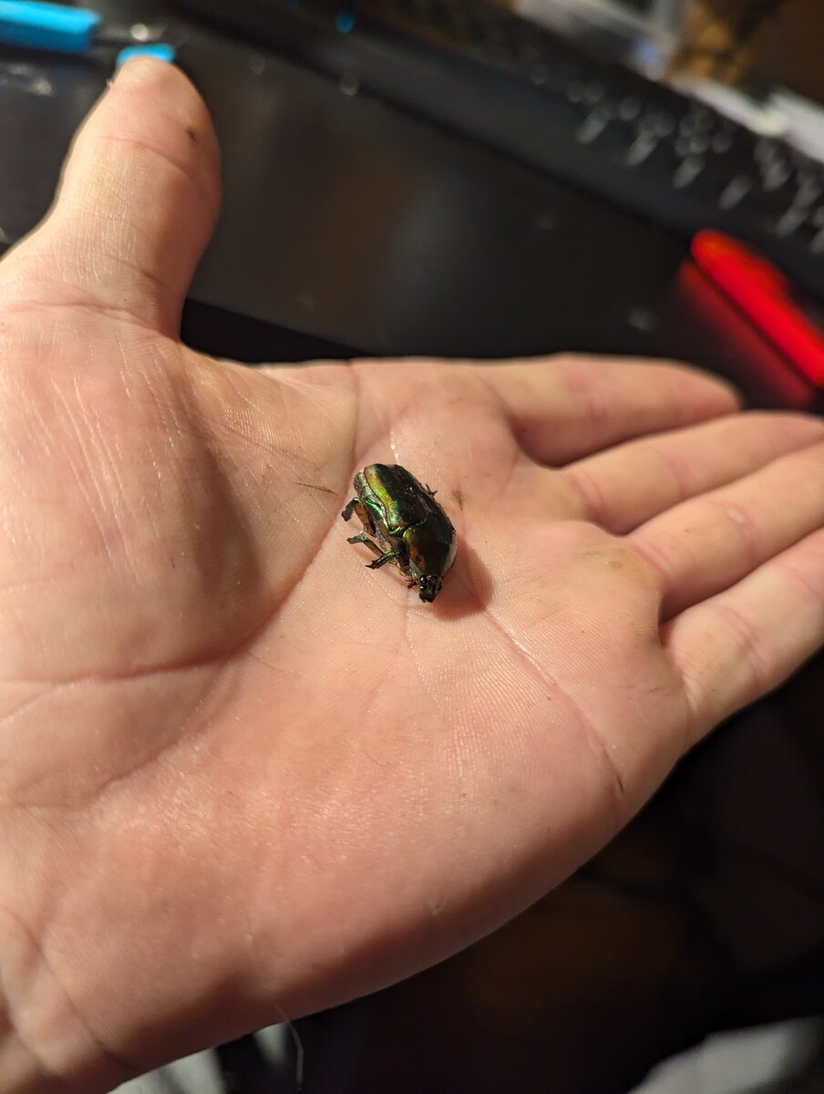 This bug is a Rainbow Scarab (Phanaeus vindex), a species of dung beetle known for its vibrant, iridescent colors.