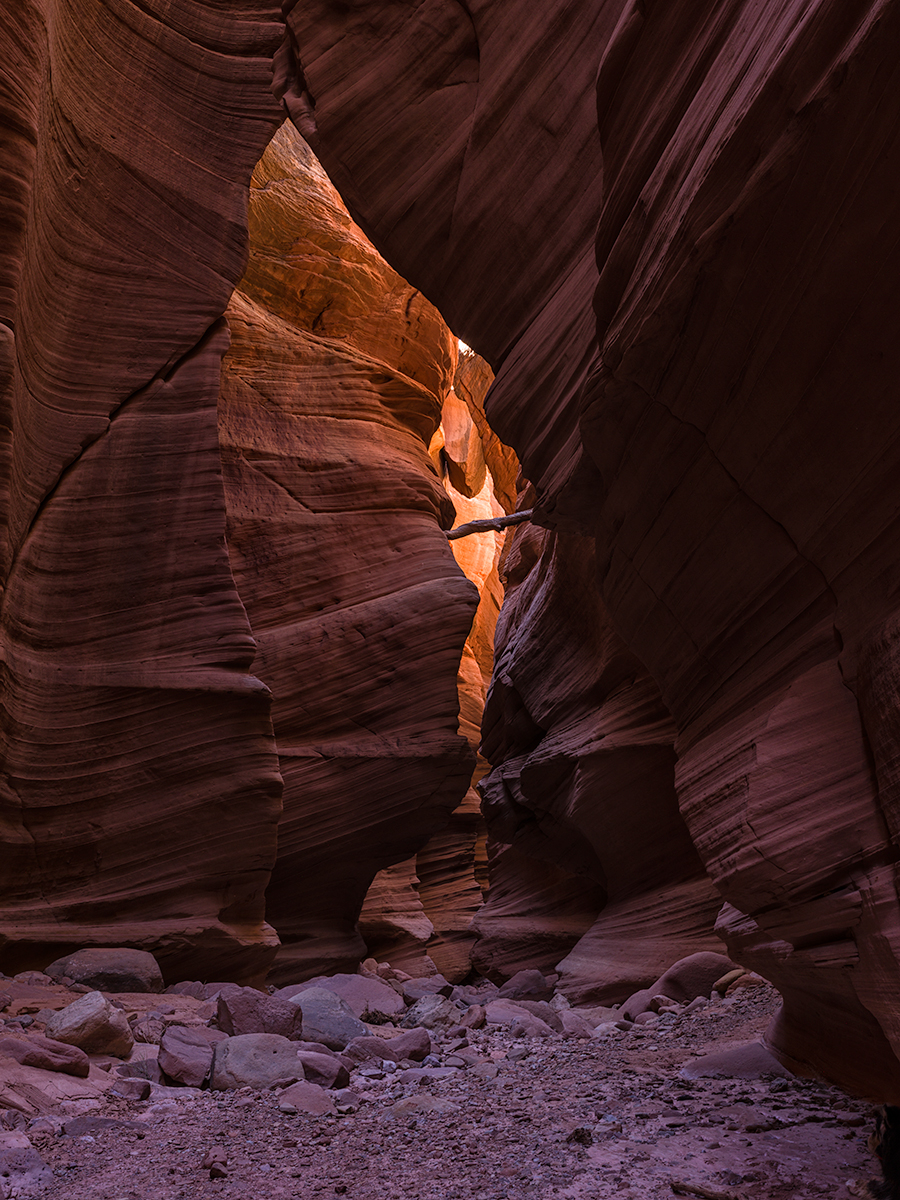 Previously, I had gotten some nice light at the entrance but not further in. This time it was the opposite. I got there earlier in the day, but about a month later in the year. I'm assuming that the sun was that much higher in the sky, so hit the canyon walls differently. I spoke with a photographer who was on his way out the day before I went in. He mentioned some pools of water & mud..... that I found he had left his tracks in. Unavoidable, really, but I avoided those compositions. The log jams were a good 40-50' off the canyon floor.