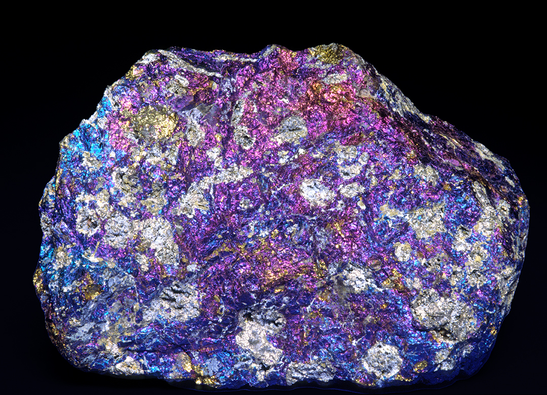 Bornite (purplish), also known as Peacock Ore from the copper mines of Butte Montana. The gold color is Chalcopyrite.
