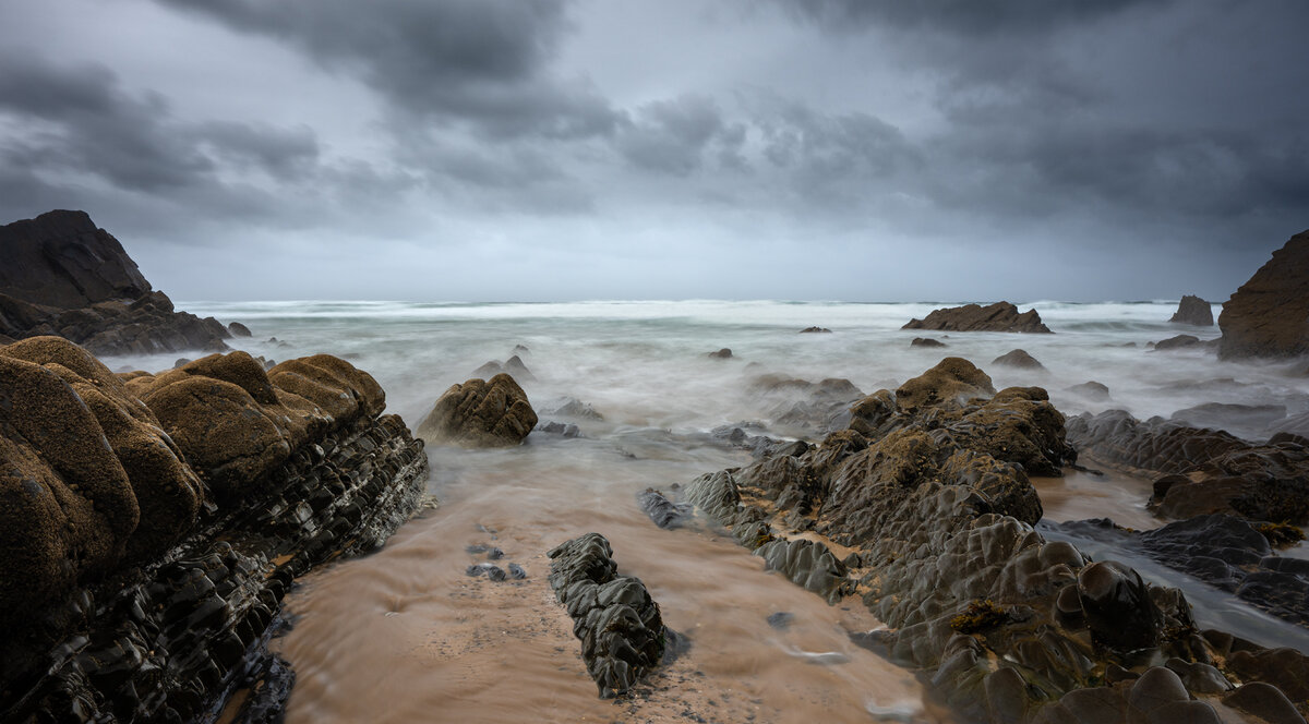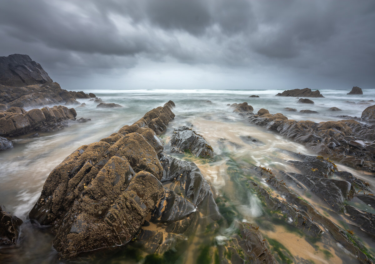 This was our last day in Cornwall. We were packing up to return to our friend's house in Devon and decided to visit one last coastal location despite the terrible weather, low scudding clouds, intermittent heavy rain and a very brisk wind. The day before I had got a little too close to a breaking wave and had got wet with the wave breaking over my wellies so it was trainers on my feet. The tide was just about perfect, high and falling and the aforementioned wind was whipping up some waves . I did expect to get wet as I was jumping onto the rocks as the waves rushed in and then shooting the backwash but I did manage to stay dry. Thankfully the rocks were very sticky due to the crustacea and, apart from the rain, I manged to stay dry. Ken