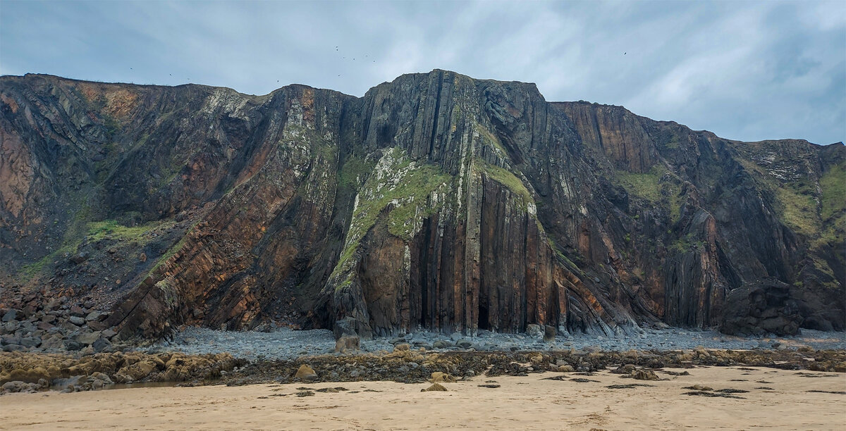 I had visited 3 days earlier but the tide was out revealing a 6 mile wide beach several hundred yds deep. The cliffs however were wonderful. Difficult to get a scale but my maps tell me that they are 150ft high and very unstable