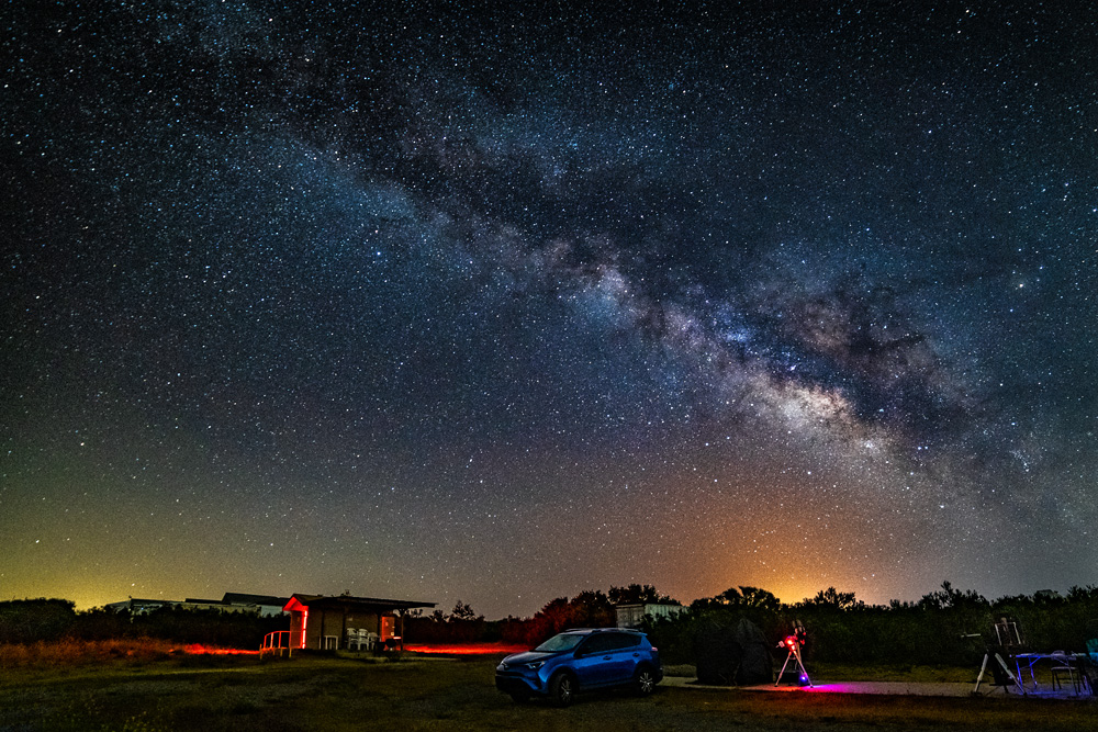 PS. I decided to keep the colorful light pollution on the horizon since I thought it worked well with the reds and blues of the astro equipment on the ground.