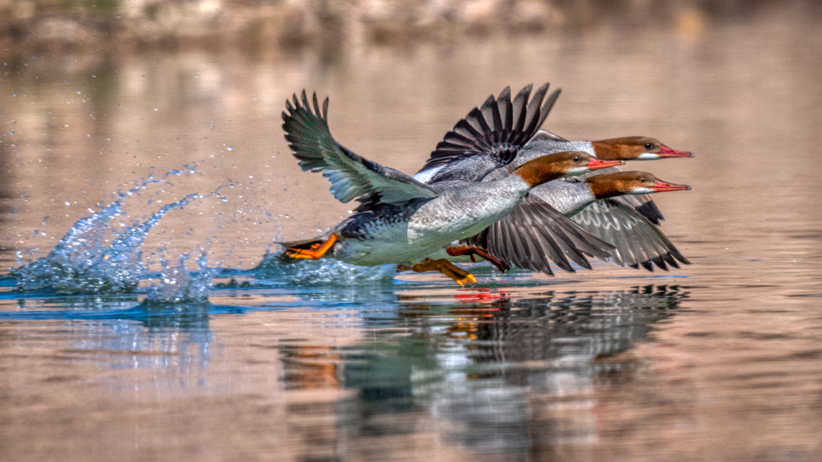 Three female mergansers, feet lifted and wings churning, sprint across the surface like they’ve got somewhere important to be—together. These sleek divers chase fish underwater with speed and precision, using long, serrated bills like built-in steak knives. When it’s time to go airborne, they don’t coast—they blast off.
