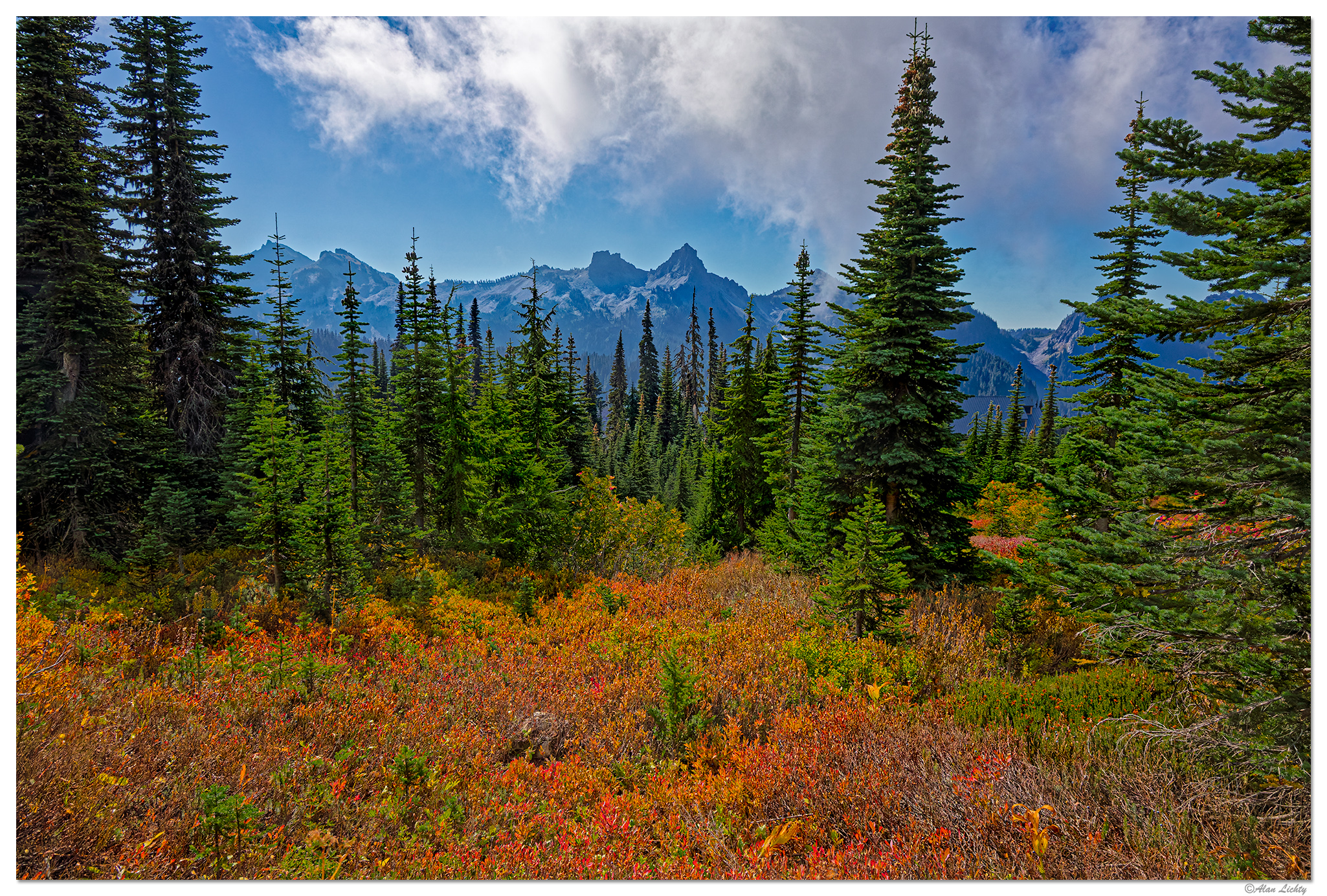 One more fall shot from Mt. Rainier National Park - a view looking towards the Tatoosh mountain range from the meadows above Paradise Inn. I was enchanted with the backlit colors of the foreground vegetation.