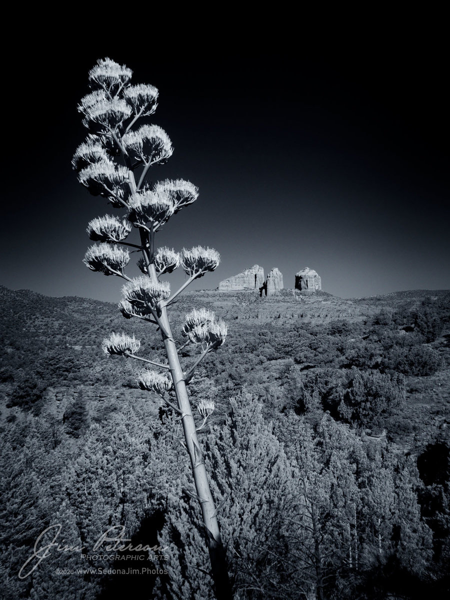 Along The Llama Trail (Infrared). A blooming century plant (or agave) enjoys its 15 minutes of fame and glory, with Cathedral Rock serving as the backdrop. These plants typically live 10-30 years before blooming, and then die immediately afterwards. This scenic trail is south of Sedona, Arizona in the Coconino National Forest.