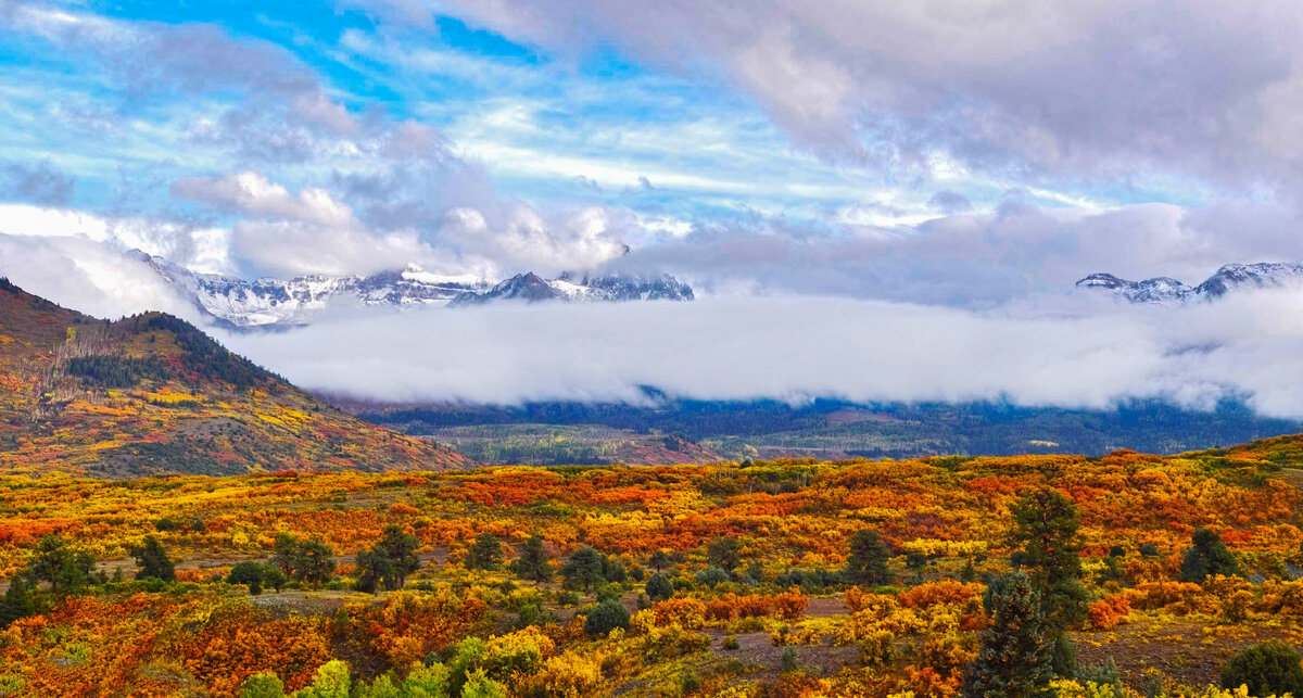 Morning cloud were lifting over the Dallas Divide near Ouray, Colorado on a colorful fall day.