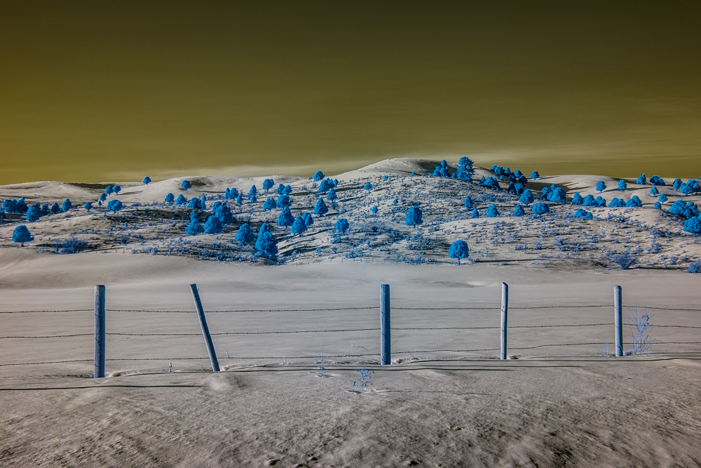 Following on the heals of Alan's "Fenced" IR image, I have one that I was working on that included a different fence, a bit more modern in construction. This was on the road leading from Idaho Falls heading East to the Grand Teton National Park. It had just snowed, so there wasn't really places to park along the side of the road, fortunately driving off and into the snow wasn't an issue in my Jeep.