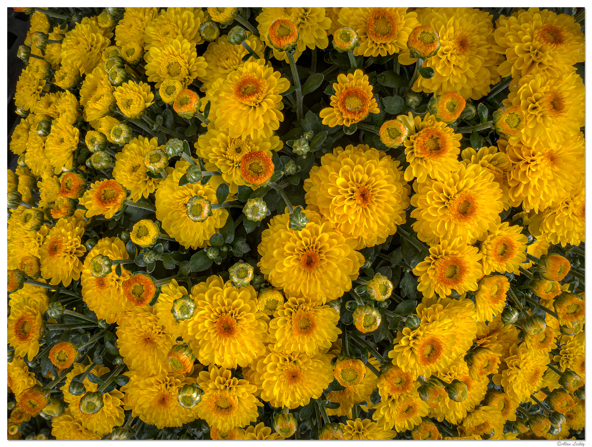 Florist's Daisy is one of the ascribed names for the blooms of Chrysanthemum x morifolium or garden mum. The plant has been cultivated since 500 BCE in China where it was originally used for medicines prior to being bred for its beautiful blooms. There are over 30,000 cultivars of this plant. This specimen was in a pot on a rack near the entrance of a grocery store I visited yesterday.