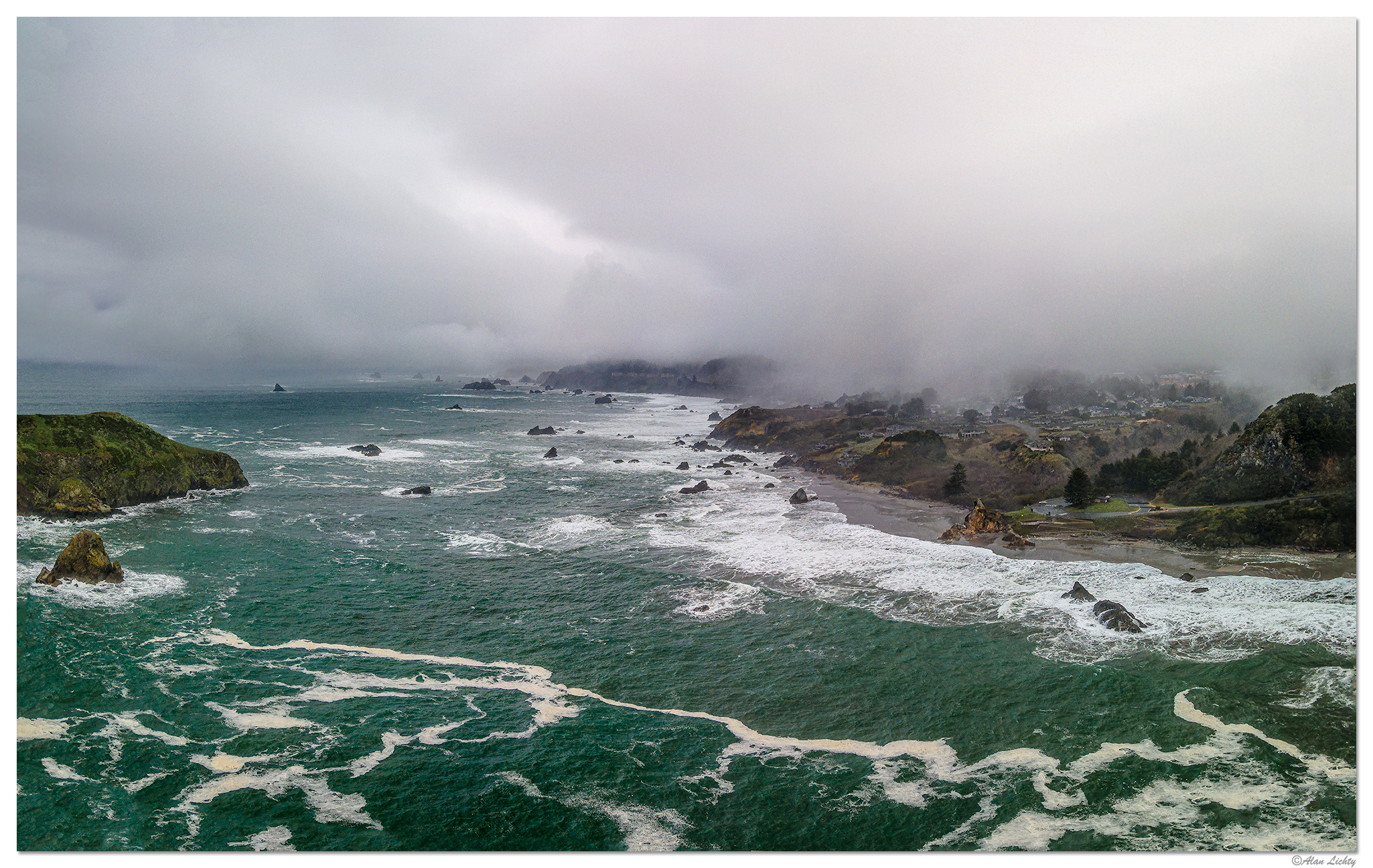 A 3 panel panorama with some low clouds/fog along the Oregon coastline just north of Brookings. Shot with a Mavic Air 2 a couple of years ago. I had forgotten I shot this as a panorama sequence until I stumbled across it in my archive.