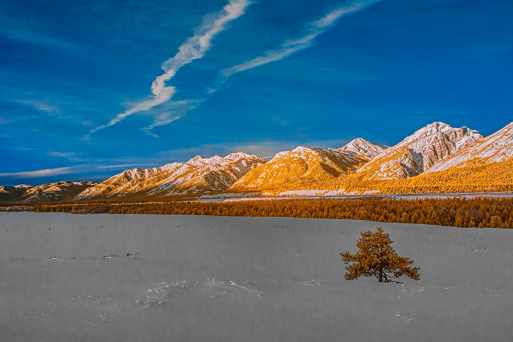 A few weeks back in the Grand Tetons. After a night of star photography, the sun rose and the clouds (or vapor trails) looked cool. The ground is still in shadow.