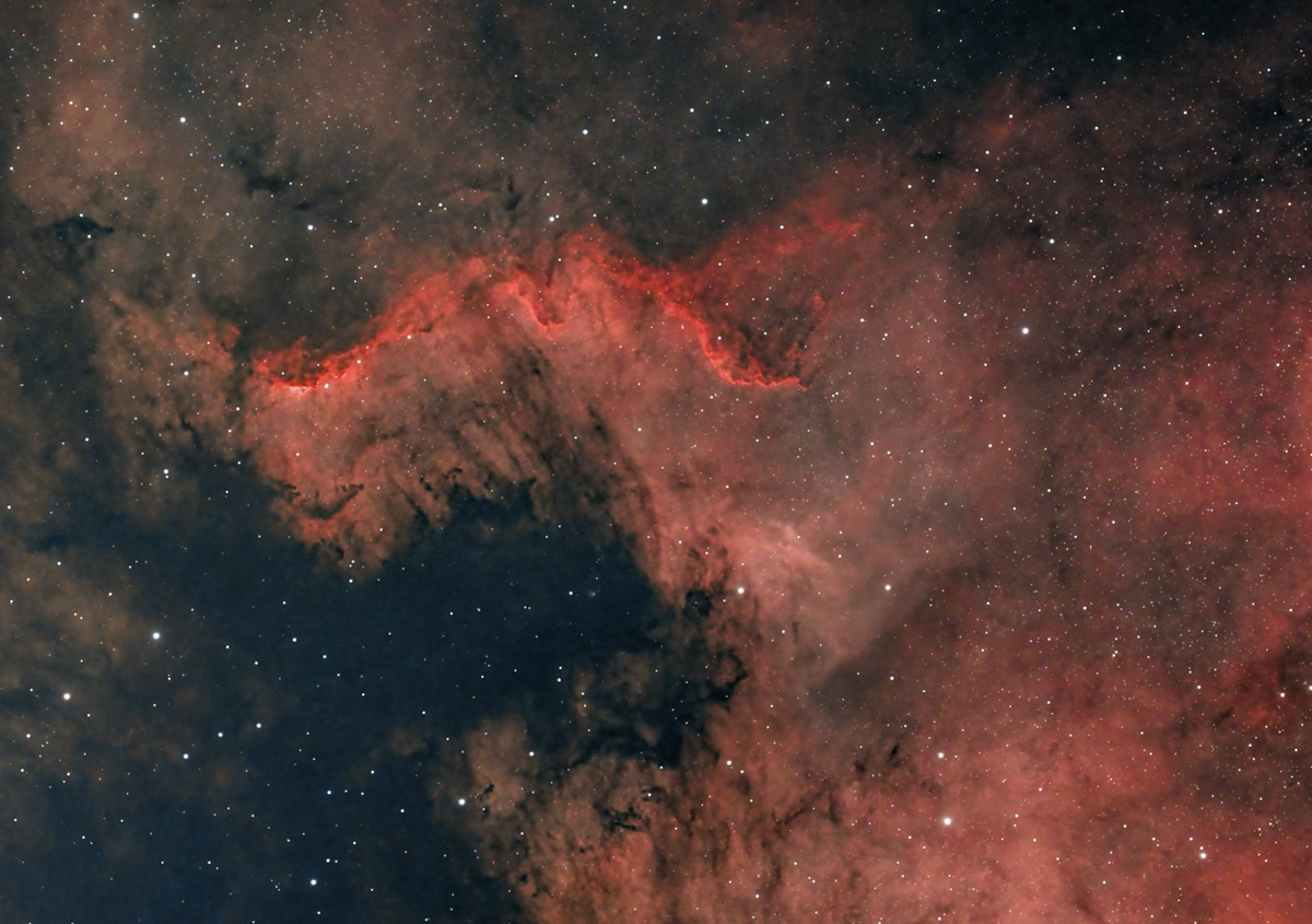 This is a wider view of the Cygnus Wall which is part of the larger North American nebula. My focus was to go after the Cygnus Wall last night, which would require cropping. That's not a big deal with the ASI2600mc Pro, as it's super croppable. But what could have and maybe should have been a problem was the 94% moon, and even worse then that is the fact that in Southern California, I am probably sitting at Bortle 10. If you have been to Los Angeles, you know, it's hundreds of miles of lights. And imaging from my small patio here, there are streetlights and all sorts of other lights. But the Optolong L-Enhance filter did a great job of blocking out a lot of the Light Pollution. I was so desperate to do some Deep Space Astro, I was willing to try anything and any conditions.