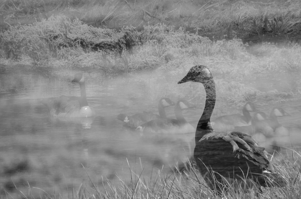 thank youWhat are you talking about Darcy, this is excellent....love it! Black and White was definitely the way to go. This looks like the goose on the bank is having memories of the past.