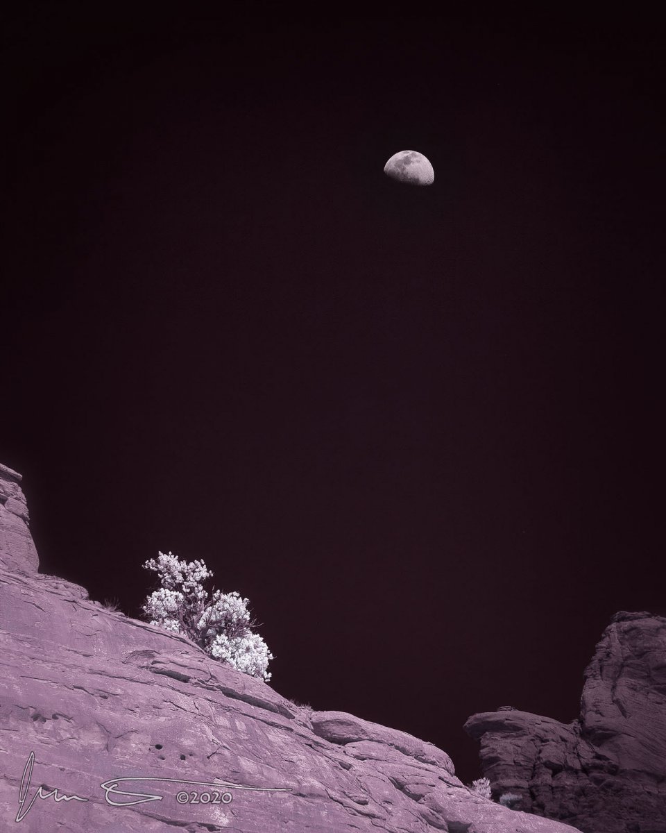 Turkey Creek Moon (Infrared). Here’s a bit of infrared minimalism – an early spring half moon above the red sandstone cliffs overlooking the Turkey Creek trail. A blue sky can come out very dark when photographed in infrared, as exemplified in this scene in the Coconino National Forest outside of Sedona.