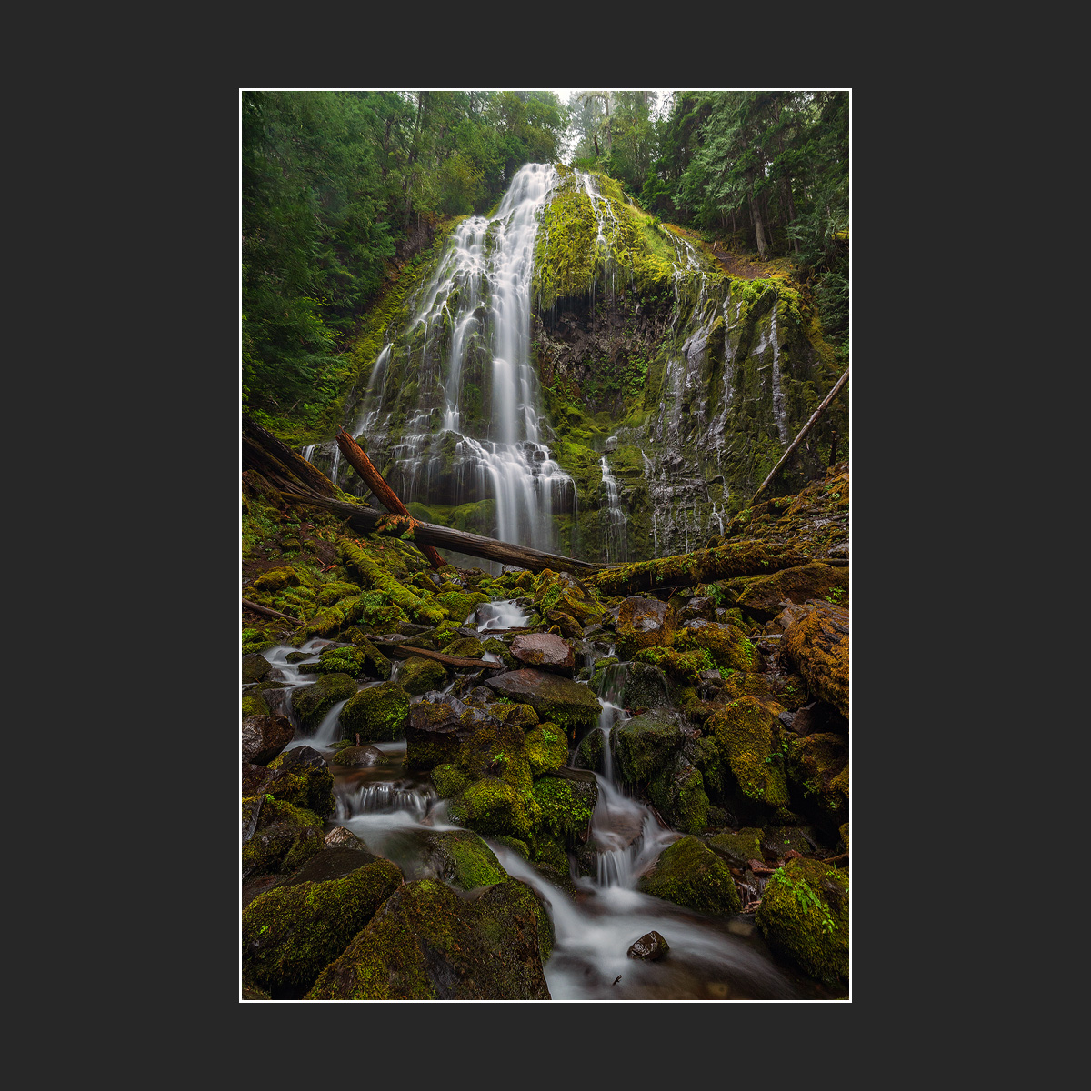 This is Proxy Falls in Central Oregon on a rainy September day. I had a great time there - a lovely hike with no one around in the early morning. The hardest part was having to cross the creek to find a better vantage point. The jagged, slippery rocks and ice cold water made it quite challenging to stay upright while keeping my camera gear high and dry.