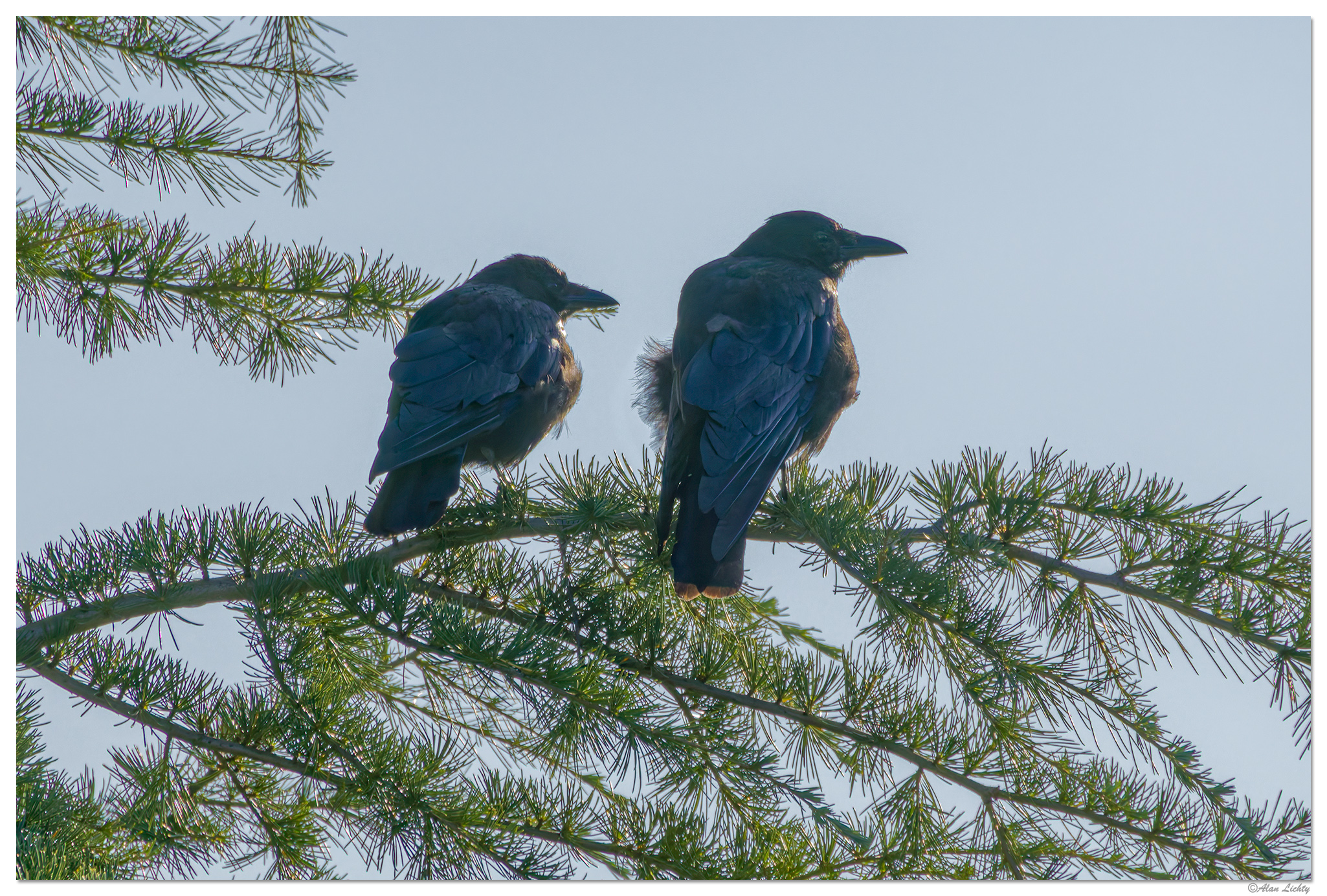 My offering for today is a shot of a young crow on a branch next to its mother. The young one is on the right.